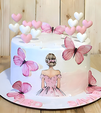 The Fluttering Grace Cake is a beautifully designed cake that will add a touch of elegance and sophistication to any special occasion. The dessert showcases a stunning feminine design, adorned with delicate fondant butterflies. Available in five delectable flavors, including chocolate, red velvet, oreo, strawberry, and neopolitan, each bite of this treat is a perfect combination of flavor and texture. The attention to detail in the cake's design and decoration is truly remarkable, making it a perfect centerpiece for any celebration.